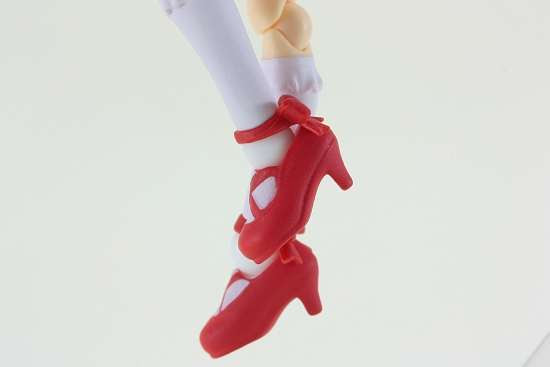 Os sapatos têm um salto alto, mas podem ficar de pé sem o auxílio de suportes. Ainda, o laço de fita no tornozelo é móvel.