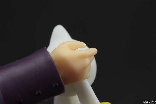 O modelo vem com mãos anguladas, mas sem articulações, e por isso não é difícil segurar a lança com as duas mãos.