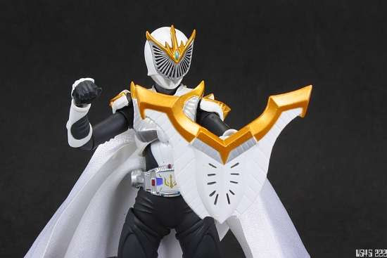 Visão de corpo inteiro. A capa e a cor branca dão um ar bastante nobre e elegante à figura. Na verdade ela seria uma versão feminina do Kamen Rider Knight, mas foram feitas mudanças e ela adquiriu características próprias.